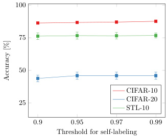 Fine-tuning the network through self-labeling further enhances the quality of the cluster assignments (81.8% to $87.6%$ ). During self-labeling, the network corrects itself as it gradually becomes more confident (see Figure 4). Importantly, in order for self-labeling to be successfully applied, a shift in augmentations is required (see Table 1 or Figure 5). We hypothesize that this is required to prevent the network from over fitting on already well-classified examples. Finally, Figure 6 shows that self-labeling procedure is not sensitive to the threshold’s value.