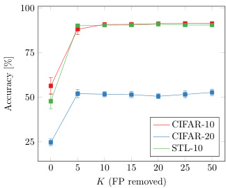 Convergence. Figure 8 shows the results when removing the false positives from the nearest neighbors, i.e. sample-pairs which belong to a different class. The results can be considered as an upper-bound for the proposed method in terms of classification accuracy. A desirable characteristic is that the clusters quickly align with the ground truth, obtaining near fully-supervised performance on CIFAR10 and STL10 with a relatively small increase in the number of used neighbors $K$ . The lower performance improvement on CIFAR100-20 can be explained by the ambiguity of the super classes used to measure the accuracy. For example, there is not exactly one way to group categories like omnivores or carnivores together.