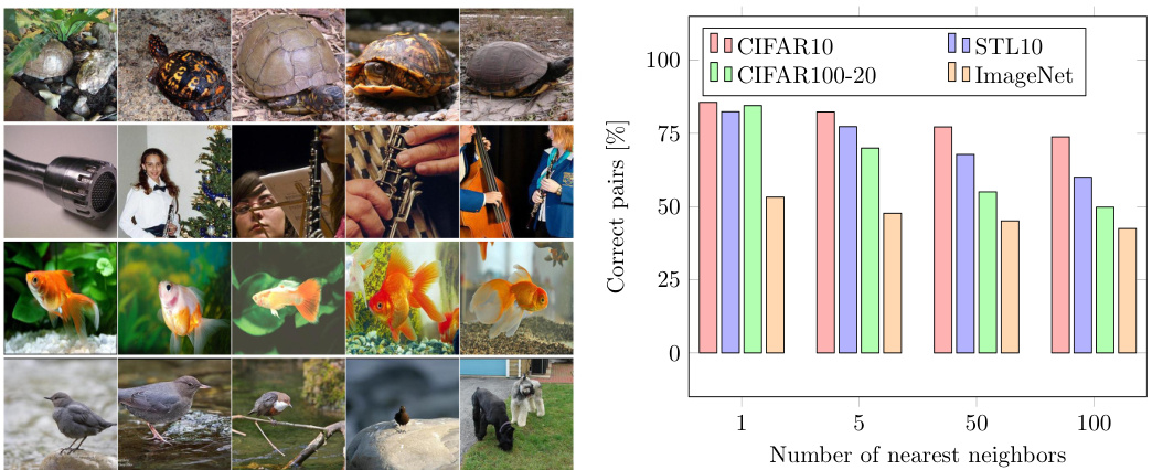 Let us first consider the following experiment. Through representation learning, we train a model $\boldsymbol{\phi}_ {\theta}$ on the unlabeled dataset $\mathcal{D}$ to solve a pretext task $\tau$ , i.e. instance discrimination [7,18]. Then, for every sample $X_{i}\in{\mathcal{D}}$ , we mine its $K$ nearest neighbors in the embedding space $\boldsymbol{\phi}_ {\theta}$ . We define the set $\mathcal{N}_ {X_{i}}$ as the neighboring samples of $X_{i}$ in the dataset $\mathcal{D}$ . Figure 2 quantifies the degree to which the mined nearest neighbors are instances of the same semantic cluster. We observe that this is largely the case across four datasets1 (CIFAR10 [27], CIFAR100-20 [27], STL10 [9] and ImageNet [11]) for different values of $K$ . Motivated by this observation, we propose to adopt the nearest neighbors obtained through the pretext task $\tau$ as our prior for semantic clustering.