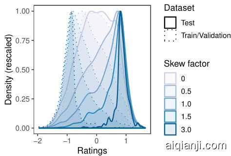 图 1: 不同偏斜因子下训练/验证集与测试集中人工评分的分布情况。