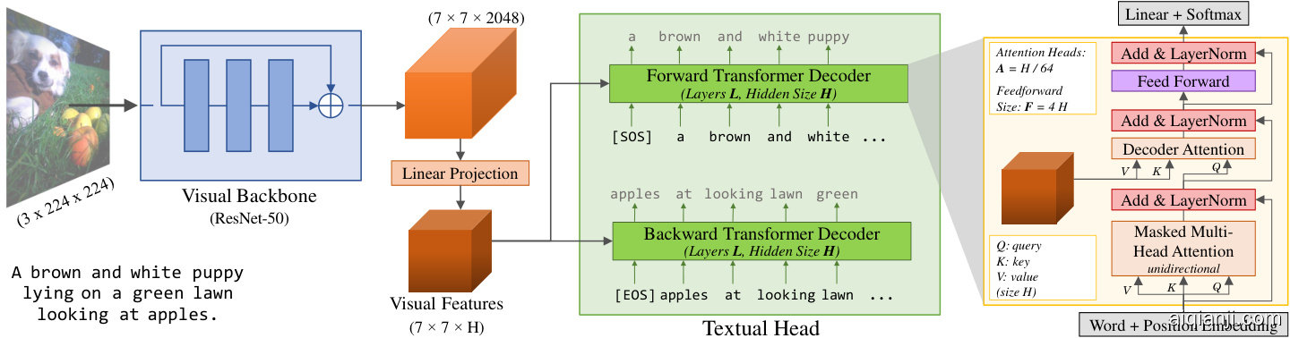图 3: VirTex预训练框架: 我们的模型由视觉主干网络(ResNet-50)和文本头部网络(两个单向Transformer)组成。视觉主干网络提取图像特征,文本头部网络通过双向语言建模(双字幕生成)预测描述文本。Transformer对字幕特征执行掩码多头自注意力机制,并对图像特征进行多头注意力计算。该模型采用端到端方式从头训练。预训练完成后,视觉主干网络可迁移至下游视觉识别任务。