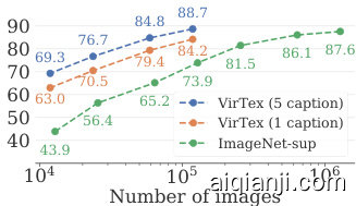 图 4: 数据效率对比:我们比较了使用不同数量图像训练的VirTex和INsup模型。尽管VirTex使用的图像数量少10倍,但在下游任务中仍能接近或显著超越IN-sup。IN-1k:使用≤10^5图像的模型为5次试验均值,标准差≤1.0。