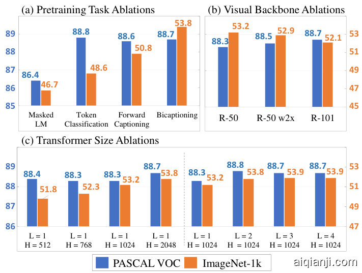 Figure 5: Ablations. (a) Pre training Tasks: Bi captioning improves over weaker pre training tasks – forward captioning, token classification and masked language modeling. (b) Visual Backbone: Bigger visual backbones improve downstream performance – both, wider   $(\mathbf{R}{-}50~\mathbf{w}2{\times})$   and deeper (R-101). (c) Transformer Size: Larger transformers (wider and deeper) improve downstream performance.
