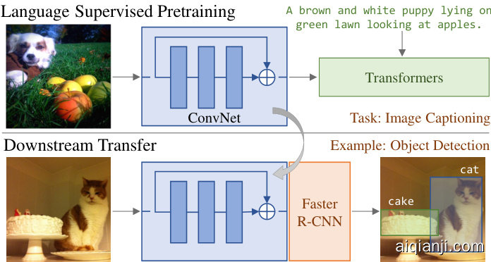 图 1: 从语言中学习视觉特征:首先,我们使用图像-标题对联合训练一个卷积网络 (ConvNet) 和 Transformer,用于图像描述任务(上图)。然后,将学习到的卷积网络迁移到多个下游视觉任务中,例如目标检测(下图)。