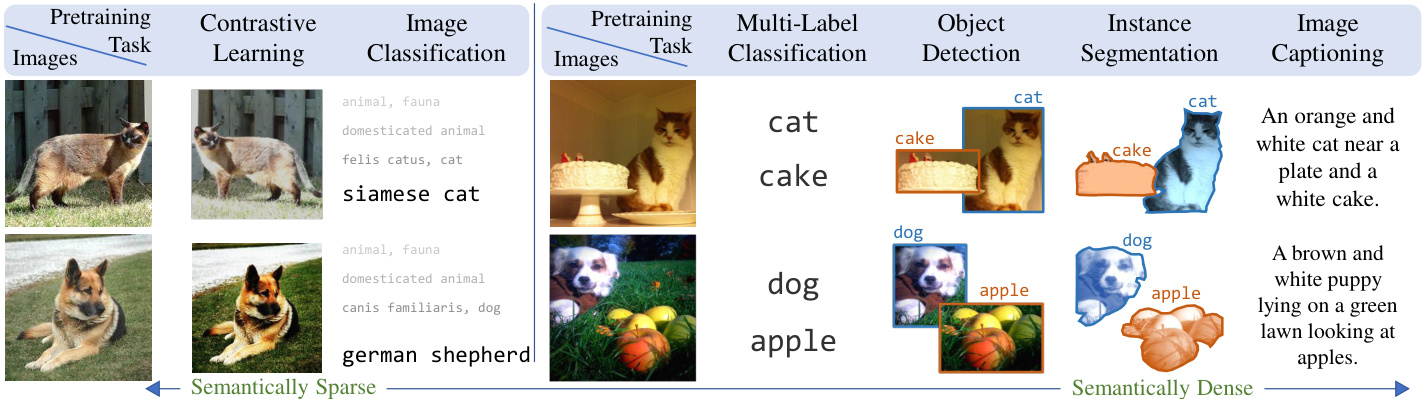 图 2: 视觉表征学习的预训练任务对比:对比自监督学习方法提供语义稀疏的学习信号,鼓励图像的不同变换具有相似特征。图像分类将图像与单一语义概念配对,提供中等语义密度。多标签分类、目标检测和实例分割通过标记和定位多个对象来增加语义密度。描述文本则通过描述多个对象及其属性、关系和动作,提供语义密集的学习信号。本工作旨在利用描述文本的这种语义密度,以数据高效的方式学习视觉表征。