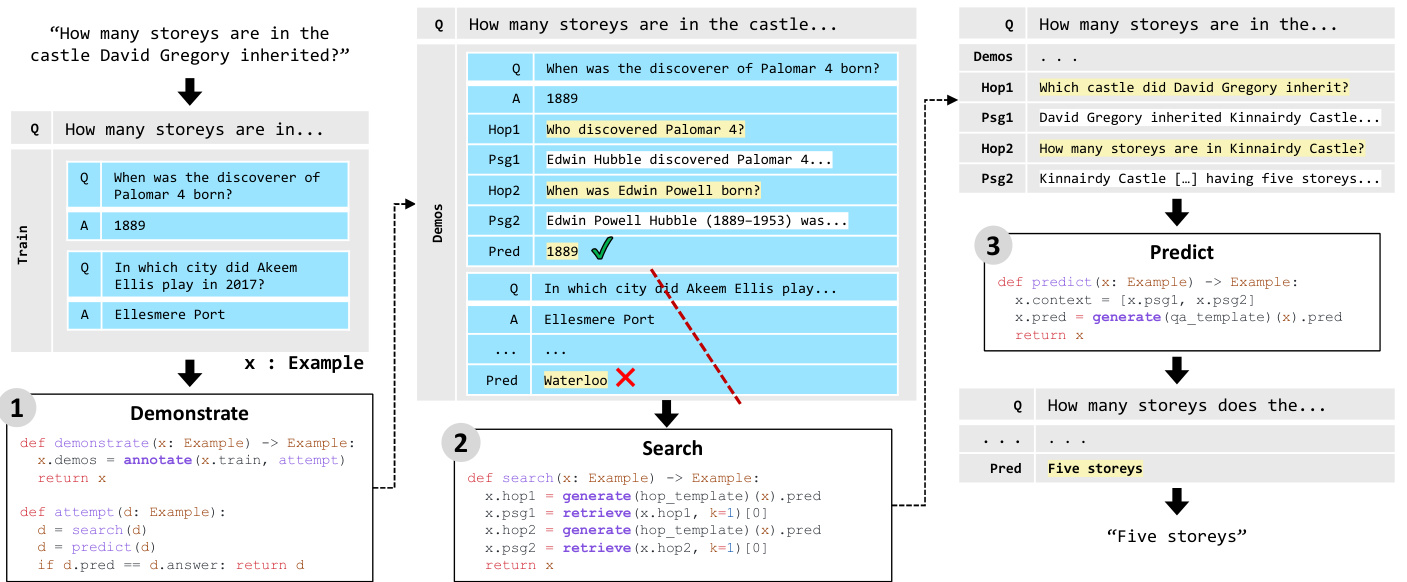 Retrieval-augmented in-context learning has emerged as a powerful approach for addressing knowledge-intensive tasks using frozen language models (LM) and retrieval models (RM). Existing work has combined these in simple “retrievethen-read” pipelines in which the RM retrieves passages that are inserted into the LM prompt. To begin to fully realize the potential of frozen LMs and RMs, we propose DEMONSTRATE– SEARCH–PREDICT (DSP), a framework that relies on passing natural language texts in sophisticated pipelines between an LM and an RM. DSP can express high-level programs that bootstrap pipeline-aware demonstrations, search for relevant passages, and generate grounded predictions, systematically breaking down problems into small transformations that the LM and RM can handle more reliably. We have written novel DSP programs for answering questions in open-domain, multi-hop, and conversational settings, establishing in early evaluations new state-of-the-art incontext learning results and delivering $37-120\%$ , $8-39\%$ , and $80{-}290\%$ relative gains against the vanilla LM (GPT-3.5), a standard retrieve-thenread pipeline, and a contemporaneous self-ask pipeline, respectively. We release DSP at https: //github.com/stanford nlp/dsp.