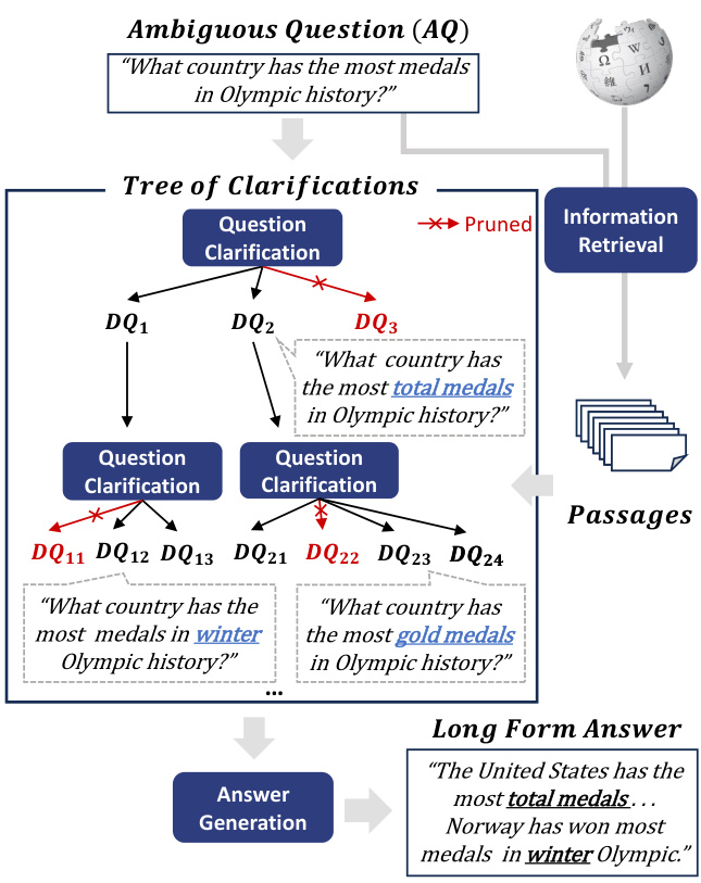 To address the challenges and provide a longform answer to AQ, we propose a novel framework, TREE OF CLARIFICATIONS (TOC): It recursively constructs a tree of DQs for the AQ—via few-shot prompting leveraging external knowledge—and uses it to generate a long-form answer. More specifically, first, relevant passages for the AQ are retrieved. Then, leveraging the passages, DQs for the AQ are recursively generated via few-shot prompting and pruned as necessary. Lastly, a long-form answer addressing all DQs is generated. The tree structure promotes exploring DQs in targeting par- ticular dimensions of clarification, addressing the first challenge, and the external sources offer additional knowledge to cope with the second challenge.