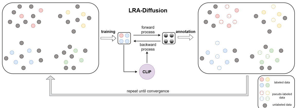图 1: Diff-SySC 总体框架。LRA-Diffusion 模型在标注数据集上进行训练。每次迭代结束时生成的高置信度伪标签会被加入标注集,该训练过程重复直至收敛。