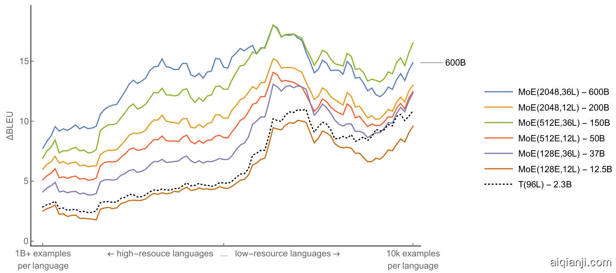 我们致力于提升从全部100种语言到英语的翻译质量(以BLEU分数[48]衡量)。这产生了约130亿个用于模型训练的训练样本。为建立基线,我们为每个语言对(例如德语到英语的单一模型)分别训练了双语神经机器翻译模型,并根据每种语言的可用训练数据进行调优。我们未展示各语言对的独立BLEU分数,而是遵循惯例将基线置于$x$轴零点位置,并报告采用GShard训练的大规模多语言模型的$\Delta$ BLEU趋势线(见图6)。图6中$x$轴按训练数据量从多到少从左至右排序,最左侧对应高资源语言,最右侧对应低资源语言。需要重申的是,通用机器翻译的终极目标是使单一多语言模型的$\Delta$ BLEU趋势线超越所有考量语言的基线。我们还纳入了一个密集96层Transformer编码器-解码器网络T(96L)变体作为另一条基线(图6虚线趋势线),该模型采用GPipe流水线并行在相同数据集上训练。在2048个TPU v3核心上耗时6周完成收敛训练,其表现优于原始GPipe T(128L)[15],是我们对比中使用的最强单一密集模型基线。
