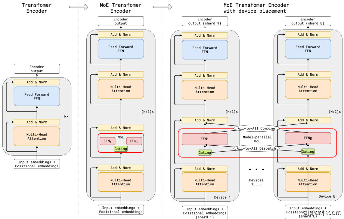 图 3: 带MoE层的Transformer编码器扩展示意图。MoE层每隔一个Transformer前馈层进行替换,解码器修改方式类似。(a) 标准Transformer模型的编码器是由自注意力层和前馈层交错堆叠而成,其间带有残差连接和层归一化。(b) 每隔一个前馈层替换为MoE层后,即形成MoE Transformer编码器模型结构。(c) 当扩展到多设备时,MoE层会在设备间分片,而其他所有层都会被复制。