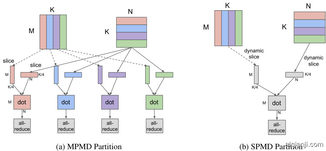 Figure 2: Comparison between MPMD and our proposed SPMD partitioning of a Dot operator  $([\bar{M},K]\times[K,\bar{N}]=[M,N])$   across 4 devices. In this example, both operands are partitioned along the contracting dimension  $K$  , where each device computes the local result and globally combines with an AllReduce. MPMD partitioning generates separate operators for each device, limiting its s cal ability, whereas SPMD partitioning generates one program to run on all devices. Note that the compilation time with our SPMD partitioning is not-dependent of the number of devices being used.