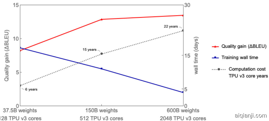 Figure 1: Multilingual translation quality (average  $\Delta$  BLEU comparing to bilingual baselines) improved as MoE model size grows up to 600B, while the end-to-end training cost (in terms of TPU v3 core-year) only increased sub linearly. Increasing the model size from 37.5B to 600B (16x), results in computation cost increase from 6 to 22 years (3.6x). The 600B parameters model that achieved the best translation quality was trained with 2048 TPU v3 cores for 4 days, a total cost of 22 TPU v3 core-years. In contrast, training all 100 bilingual baseline models would have required 29 TPU v3 core-years. Our best quality dense single Transformer model (2.3B parameters) achieving  $\Delta$  BLEU of 6.1, was trained with GPipe [15] on 2048 TPU v3 cores for 6 weeks or total of 235.5 TPU v3 core-years.