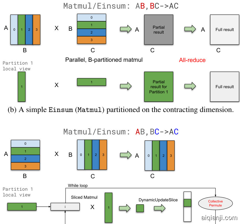 如果两个操作数都在非收缩维度上分区,则无法直接计算局部Einsum,因为操作数具有不同的非收缩维度。复制其中一个操作数不会导致冗余计算,但要求复制的操作数能放入设备内存中。因此,如果操作数过大,我们会保持两个操作数分区状态,并通过循环遍历结果的每个切片,同时使用集体置换(Collective Permute)来通信输入切片(图4c)。