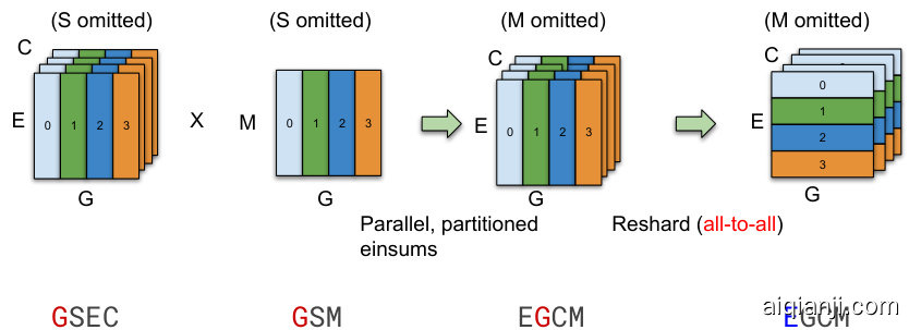 接下来,我们对线性代数计算进行标注以表达并行性。计算中的每个张量都可以使用第3.2节的分片API标注为在设备集群上复制或分布。通过分片标注实现了模型描述与高效并行实现之间的关注点分离,使用户能灵活表达多种并行化策略。例如:(1) 注意力层通过沿批次维度分割并在所有设备上复制其权重来实现并行化;(2) 由于MoE层中专家模块的庞大规模,无法在所有设备上复制专家模块,唯一可行的策略是将专家模块分片到多个设备中。此外,整个模型会在(1)-(2)两种模式间交替切换。这种标注方式使模型开发者无需关注系统优化工作,也避免了将并行实现和底层细节硬编码到模型代码中。