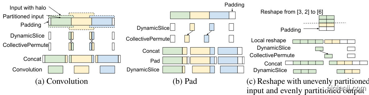 XLA算子具有静态配置,例如卷积(Convolution)中定义的填充(padding)、步长(stride)和扩张(dilation)。但不同分区可能不会使用相同的算子配置执行。例如对于一个卷积运算,最左侧分区会对其左侧应用填充,而最右侧分区会对其右侧应用填充。在这种情况下,分区器可能选择让某些分区生成略多于需求的数据配置,再切除无关部分。附录A.4讨论了卷积及类似算子的具体案例。