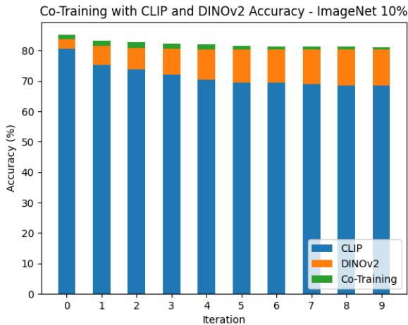 Figure 3. Top-1 accuracy of co-training iterations on the CLIP and DINOv2 views for the ImageNet  $10%$   dataset.