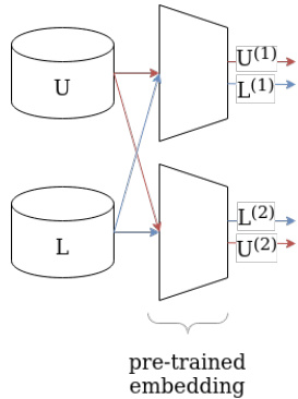 Given two pretext tasks we can train a model to accomplish each task, then use their learned embedding spaces as separate views for classification. If we have chosen our pretext tasks well, then the representations will be different, compressed, and capture sufficient information to perform the desired downstream task. Figure 1 demonstrates the idea of the method. Even if one does not have access to different views on a particular dataset, the use of different pre-trained models allows the creation of different views; as the transformation happens at the level of instances, it applies to both labeled and unlabeled batches alike as shown in Figure 1 with $L$ and $U$ respectively. However, if one has access to a dataset where the instances have two different views, then one can still obtain useful representations with this approach using even the same pre-trained model. Furthermore, one can also use multiple pre-trained models and concatenate the resulting embeddings so that two separate views with richer information content can be created and are still low-dimensional.