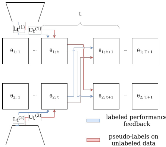 Figure 2. At each step  $t~\in~{1,\ldots,T}$   of meta co-training the models that correspond to the so-far learnt parameters   $\theta_{1;t}$   and  $\theta_{2;t}$   play the role of the student and the teacher simultaneously using batches for their respective views. Pseudo-labeling occurs on complementary views so that the teacher can provide the student with labels on an unlabeled batch. Labeled batches may, or may not, use complementary views as the purpose that they serve is to calculate the risk of the student model on the labeled batch and this result signals the teacher model to update its weights accordingly.