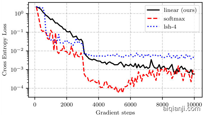 为检验线性Transformer的收敛特性,我们在带因果掩码的人工复制任务上进行训练。具体而言,这些Transformer需要复制一系列符号,类似于Kitaev等人(2020)提出的序列复制任务。我们使用最大长度为128的序列,其中包含10种不同符号并通过专用分隔符隔开。所有三种方法均采用4层Transformer结构,配备8个注意力头,批量大小为64,使用学习率为$10^{-3}$的RAdam优化器(Liu等人,2019),在3000次更新后降至$10^{-4}$。图2展示了损失随梯度步数的变化情况。我们观察到线性方法收敛平稳,且由于避免了哈希引入的噪声,最终损失低于lsh方法,尤其值得注意的是其达到了与softmax相当的损失水平。