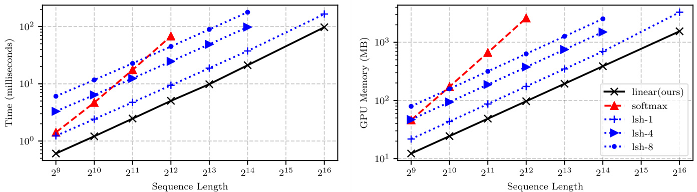Every method is evaluated up to the maximum sequence length that fits the GPU memory. For this benchmark we use an NVidia GTX 1080 Ti with 11GB of memory. This results in a maximum sequence length of 4,096 elements for softmax and 16,384 for lsh-4 and lsh-8. As expected, softmax scales quadratically with respect to the sequence length. Our method is faster and requires less memory than the baselines for every configuration, as seen in figure 1. We observe that both Reformer and linear attention scale linearly with the sequence length. Note that although the asymptotic complexity for Reformer is $\mathcal{O}\left(N\log N\right)$ , $\log N$ is small enough and does not affect the computation time.