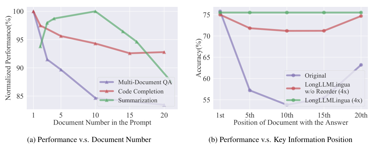 Figure 1: (a) LLMs’ performance in downstream tasks decreases with increased noise in prompts. In this case, we keep $k$ most relevant documents/paragraphs based on the ground-truth or Long LL M Lingua $r_{k}$ . A larger $k$ implies more noise introduced into the prompt. To improve the key information density in the prompt, we present question-aware coarse-to-fine compression. (b) LLMs’ ability to capture the relevant information depends on their positions in the prompt. To reduce information loss in the middle, we introduce a document reordering mechanism.