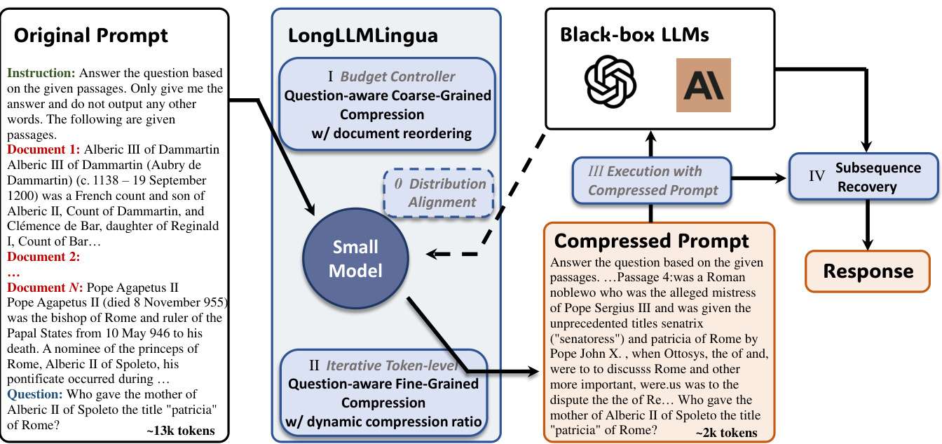 我们提出LongLLMLingua来解决大语言模型在长上下文场景下面临的三大挑战:计算成本高、性能下降和位置偏差。该方案从高效提示压缩的角度切入以降低计算开销,并创新性地设计了四个核心组件:(1) 问题感知的由粗到细压缩方法,(2) 文档重排序机制,(3) 动态压缩比率,以及(4) 子序列恢复策略,从而显著提升大语言模型对关键信息的感知能力。在多文档问答、多跳问答和长上下文基准测试中,经LongLLMLingua压缩的提示不仅推理API成本大幅降低、端到端系统延迟显著减少,其性能表现更优于原始提示。