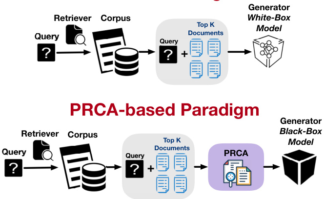 Figure 1: A comparison between two paradigms for information retrieval and generation. The upper section showcases the traditional method where a query is processed by a retriever that scans a corpus to fetch the Top-K documents and then fed to a white-box generator. The lower section introduces our proposed PRCA method, which processes extracted Top-K documents from the retriever before feeding them to black-box generator to achieve better performance for in-domain tasks.