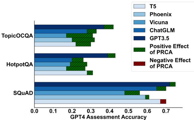 Figure 3: Comparison of performance of different generators (T5, Phoenix, Vicuna, ChatGLM, and GPT-3.5) on three benchmark datasets: SQuAD, HotpotQA, and TopicOCQA. The horizontal axis represents the GPT-4 assessment accuracy. Bars depict the performance levels of each generator, with green and red arrows indicating the enhanced or diminished effects due to PRCA integration, respectively.