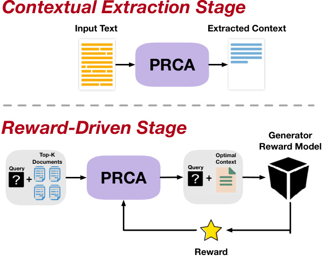 PRCA is designed to take sequences composed of the given query and the Top-K relevant documents retrieved by the retriever. The purpose of PRCA is to distill this collection of results, presenting a concise and effective context to the generator, while keeping both the retriever and the generator frozen. This PRCA-based paradigm introduces two challenges: the effectiveness of the retrieval cannot be directly evaluated due to its heavy dependence on the responses generated by the generator, and learning the mapping relationship between the generator’s outputs and the input sequence via back propagation is obstructed due to the black-box generator. To tackle these issues, we propose a twostage training strategy for PRCA, as illustrated in Figure 2. In the contextual stage, supervised learning is employed to train PRCA, encouraging it to output context-rich extractions from the input text. During the reward-driven stage, the generator is treated as a reward model. The difference between the generated answer and the ground truth serves as a reward signal to further train PRCA. This process effectively optimizes the information distillation to be more beneficial for the generator to answer accurately.