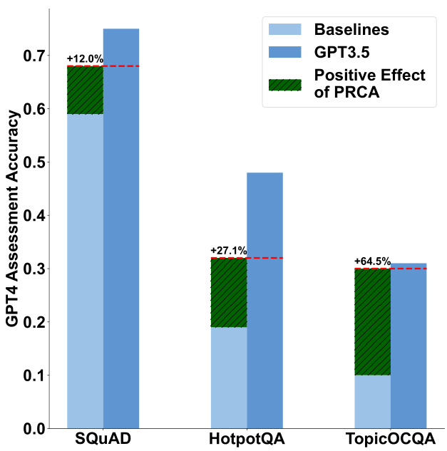 图 4: PRCA增强基线模型与GPT-3.5在SQuAD、HotpotQA和TopicOCQA上的性能对比。浅蓝和深蓝色柱分别表示基线和GPT-3.5的性能,条纹绿色柱表示PRCA带来的提升。