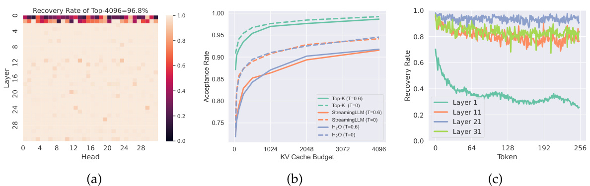Analysis The presence of sparsity within the attention blocks suggests that a fraction of KV cache could serve as a draft cache to attain a high acceptance rate during self-speculative decoding. Since KV cache is the bottleneck under this setting, we can load whole model weights with partial KV cache as a draft model. Figure 3b demonstrates that utilizing only 1K tokens could theoretically achieve a $97.6%$ acceptance rate with Top-K selection method. While this scenario represents an optimal theoretical upper bound, practical implementations like $\mathrm{H}_{2}\mathrm{O}$ and Streaming LL M exhibit promising results, achieving over $90.\dot{5}%$ acceptance rates with 1K KV cache budget. It should be noted that we maintain a full cache for the initial two layers for illustration purposes, while no layers are skipped in our practical system implementation for efficiency.