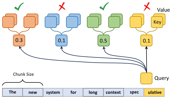 The necessity of keeping the entire KV cache in our settings allows us to select KV cache more freely (Singhal et al., 2001). This insight leads us to develop a more effective selection policy for lossless approximations. In our approach, demonstrated in Figure 4, KV cache is segmented into small chunks. During the retrieval phase, we calculate the attention between a given query and the average key cache within each chunk. This method effectively highlights the most relevant chunks, enabling us to gather KV cache with a fixed budget based on the scores. As illustrated in Table 1, retrieval-based method excels by actively identifying the most crucial information for the task rather than relying on passive and timebased cache management methods. By focusing on relevance over recency, retrieval-based policy demonstrates its potential to handle con textually dense datasets.