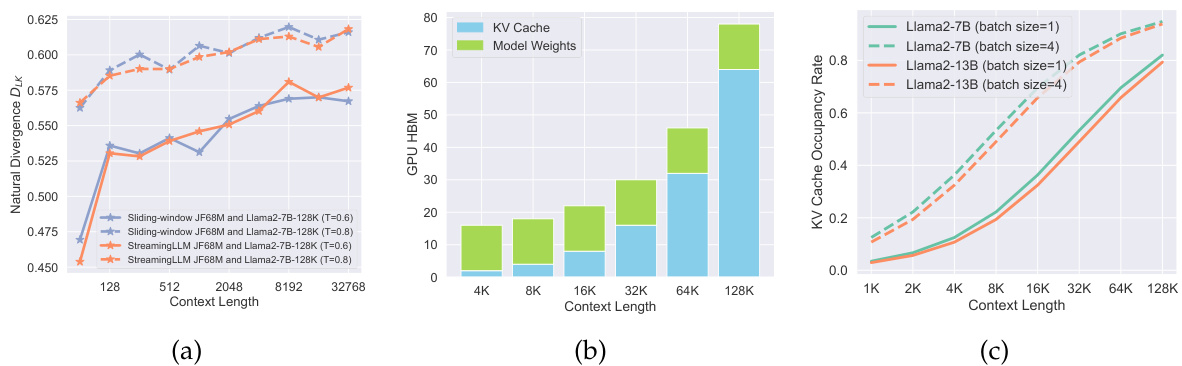 Figure 2: (a) A continuously increasing natural divergence (Leviathan et al., 2023) between the draft model with Streaming LL M or Sliding-window with Re-computation and Llama2- 7B-128K is witnessed as the sequence length increases, indicating a falling acceptance rate for speculative decoding with longer contexts. Additionally, temperature sensitivity signals a lack of robustness. (b) Compared with model weights, KV cache gradually becomes another bottleneck with long contexts. (c) KV cache occupies most of the memory as the context length increases.