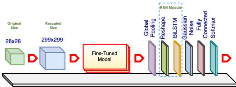 Our initial design (as discussed previously) is reused with a highlighted note that the RNN module has been incorporated. The number of units for each RNN is set to 2,048 (in the BiLSTM, the number of units is 1,024); the time step number is simply one, which shows the entire image each time. In addition, because the image size in the FashionMNIST dataset is smaller than the desired resolutions (e.g., $244\times244$ or $299\times299$ for Mobile Ne tV 1 and Inception V 3), all the images are upsampled.