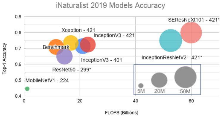 Fig. 4. i Naturalist’19 Model Accuracy. Here, “Benchmark“ denotes the Inception V 3 result using the default input setting (an image resolution of  $299\times299$  ). The sizes of the input images for the other models are indicated along with their respective names. For example, Xception-421 indicates that the input images for that model have been rescaled to  $421\times421$  .