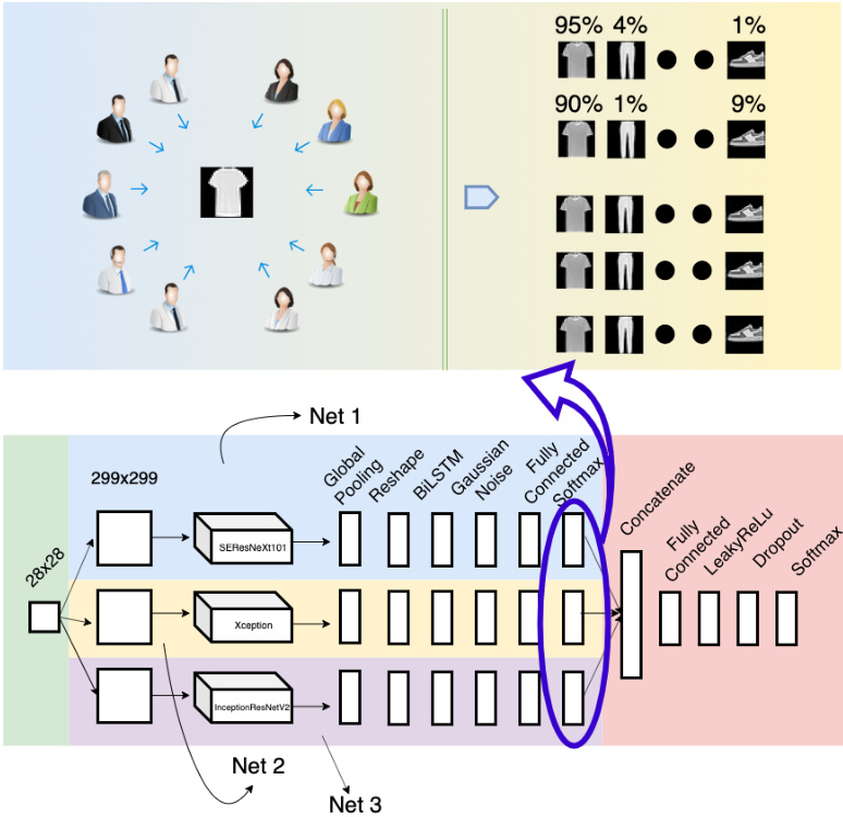 如上部分所示,每个参与者代表一个训练好的单一模型。对于每个呈现的样本,参与者会预测该样本属于每个类别的概率。这些概率随后被合并并用于训练我们的模型。