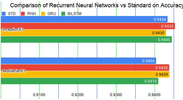 We also extended this experiment to include more models, including Xception, ResNet50, Inception-ResNetV2, VGG19 and SERe s NeXt 101. Table 2 shows the comparisons of models integrated with the BiLSTM module versus the standard models. Most of the models integrated with BiLSTMs significantly outperform the STDs, except for Inception-ResNetV2. Please note that training the VGG19 model required excessive training time; the model did not reach the same accuracy level as the other models even after 12 hours of training. Similarly, we were unable to obtain results for the VGG19-BiLSTM or SERe s NeXt 101 models. Therefore, Figure 7 shows only the results for Inception V 3, Xception, ResNet50, Inception-ResNetV2 and Mobile Ne tV 1.