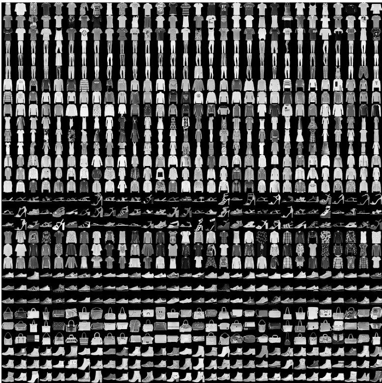 In this experiment, we employ the Fashion-MNIST dataset, which was recently created by Zalando SE and intended to serve as a direct replacement for the MNIST dataset as a machine learning benchmark because some models have achieved an almost perfect result of $100%$ accuracy on MNIST. The Fashion-MNIST dataset contains the same amount of data as MNIST–50, 000 training and 10, 000 testing samples–and includes 10 categories. Figure 5 visualizes how this dataset looks; each sample is a $28\times28$ grayscale image.