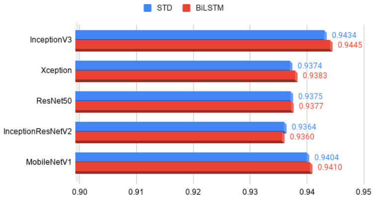 Fig. 7. Comparison of the accuracy of BiLSTM and STD models using Inception V 3, Xception, ResNet50, Inception-ResNetV2 and MobileNetV1. The BiLSTM models substantially outperform the STD models in several instances.