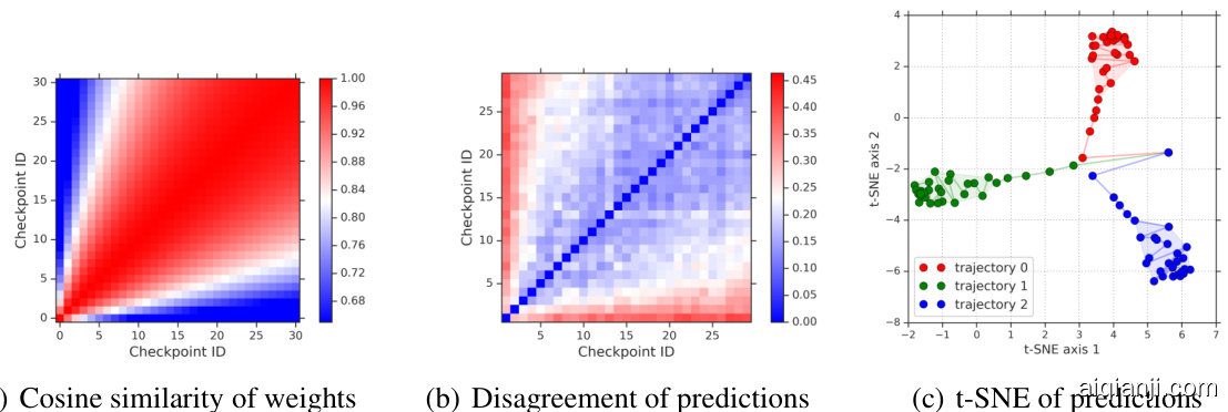 图 2: 在CIFAR-10数据集上使用SmallCNN的结果。左图: 检查点之间的余弦相似度,用于衡量优化轨迹上的权重空间对齐程度。中图: 不同检查点预测结果不一致的标签比例。右图: 对应3条不同随机初始化轨迹(不同颜色)的检查点预测结果的t-SNE可视化。