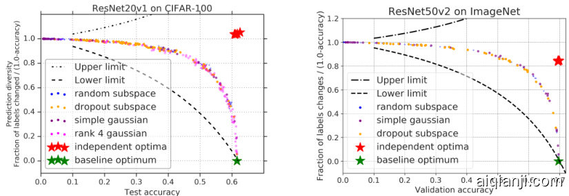 图7: ResNet20v1在CIFAR-100上及ResNet50v2在ImageNet上的多样性与准确率关系图