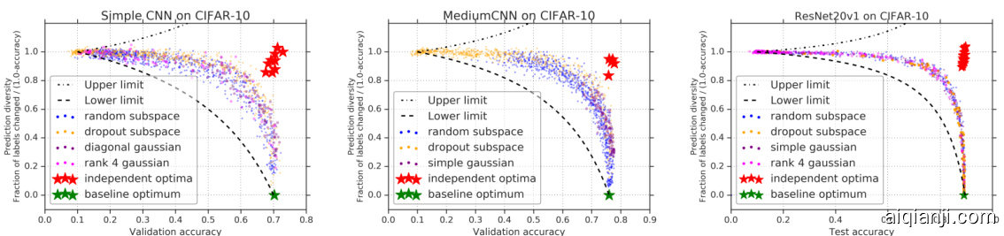 图 6: CIFAR-10数据集上训练的3个模型( SmallCNN、MediumCNN和ResNet20v1 )的多样性-准确率关系图。独立初始化和优化的解决方案(红星)比四种不同的子空间采样方法实现了更好的多样性-准确率权衡。