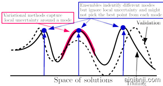 These empirical observations raise an important question: Why do deep ensembles trained with just random initialization work so well in practice? One possible hypothesis is that ensembles tend to sample from different modes3 in function space, whereas variational Bayesian methods (which minimize $D_ {\mathrm{KL}}(q(\pmb{\theta})|\dot{p}(\pmb{\theta}|{\pmb{x}_ {n},y_ {n}}_ {n=1}^{N}))$ ) might fail to explore multiple modes even though they are effective at capturing uncertainty within a single mode. See Figure 1 for a cartoon illustration. Note that while the MAP solution is a local optimum for the training loss,it may not necessarily be a local optimum for the validation loss.