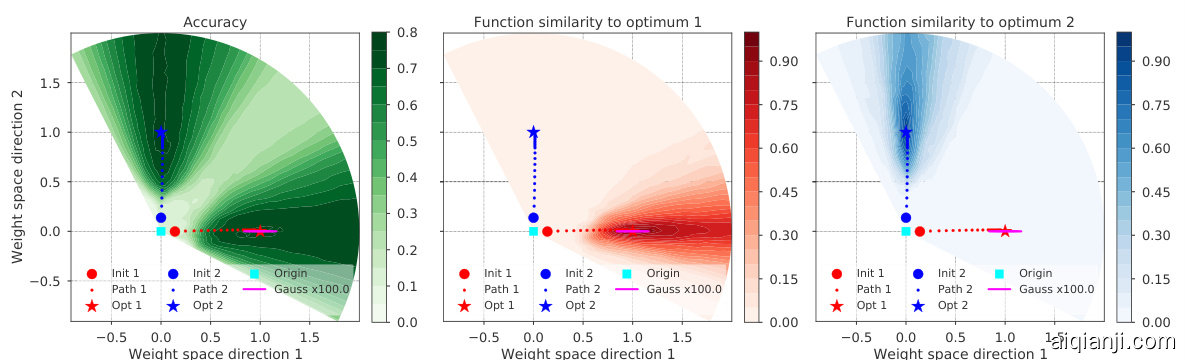 作为补充证据,图5展示了沿两个不同最优方向径向景观的二维可视化。所展示的权重空间二维截面由原点(所有权重为0)和两个独立初始化训练的最优点定义。两条轨迹(红色与蓝色所示)的权重采用标准技术初始化,并因其softmax交叉熵损失而在训练过程中径向增长。左子图显示不同随机初始化轨迹最终达到相近的准确率。我们还沿轨迹1(粉色所示)在高斯子空间中进行采样。中间与右侧子图展示了参数在通往最优1和2路径上的函数空间相似性(定义为类别预测一致点的比例)。每条轨迹(及高斯子空间)上的解与其对应最优解的相似度显著更高,这与余弦相似度和t-SNE图的结果一致。
