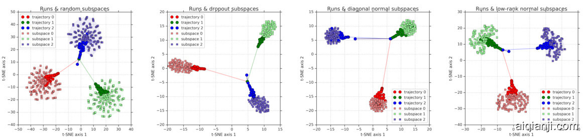 图 4: 在CIFAR-10上使用SmallCNN的结果:验证集预测的t-SNE图,展示了每条轨迹以及四种不同的子空间生成方法(用方块表示),此外还有3个独立初始化和训练的运行(不同颜色)。从图中可以看出,子空间采样的函数始终围绕其构建的运行保持在预测空间邻域内,这表明并未采样到真正不同的函数。