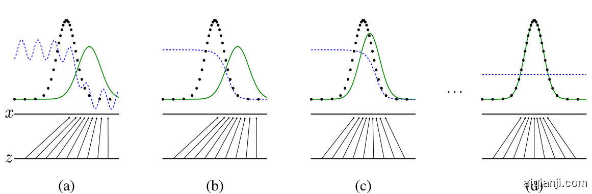 图 1: 生成对抗网络通过同时更新判别分布 ( $D$ , 蓝色虚线) 进行训练, 使其能够区分来自数据生成分布 (黑色点线) $p_ {x}$ 和生成分布 $p_ {g}$ (G) (绿色实线) 的样本。下方水平线表示均匀采样的 $_ {z}$ 域, 上方水平线表示 $_ {\pmb{x}}$ 域的一部分。箭头展示了映射 ${\pmb x}=G({\pmb z})$ 如何在转换样本上施加非均匀分布 $p_ {g}$ 。 $G$ 在 $p_ {g}$ 高密度区域收缩, 在低密度区域扩展。(a) 收敛附近的对抗对: $p_ {g}$ 近似 $p_ {\mathrm{data}}$ , $D$ 是部分准确的分类器。(b) 算法内循环中, $D$ 被训练来区分数据样本, 收敛至 $D^{* }(x)=$ pdatap(dxat)a+(xp)g(x) 。(c) 更新G后, D的梯度引导G(z)流向更可能被分类为数据的区域。(d) 经过多步训练后, 若 $G$ 和 $D$ 具有足够容量, 将达到 $p_ {g}=p_ {\mathrm{data}}$ 的平衡点, 此时判别器无法区分两个分布, 即 $\textstyle D({\pmb x})={\frac{1}{2}}$ 。