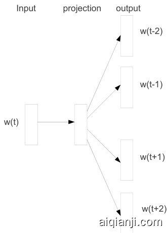 图 1: Skip-gram模型架构。训练目标是学习擅长预测邻近单词的词向量表示。