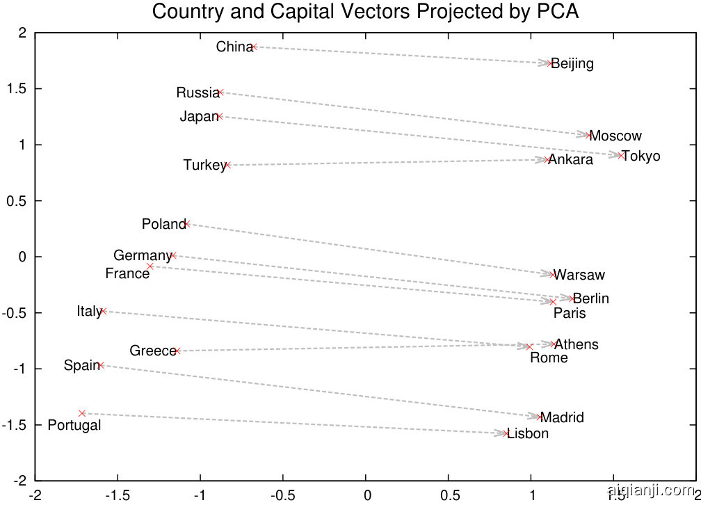 Figure 2: Two-dimensional PCA projection of the 1000-dimensional Skip-gram vectors of countries and their capital cities. The figure illustrates ability of the model to automatically organize concepts and learn implicitly the relationships between them, as during the training we did not provide any supervised information about what a capital city means.