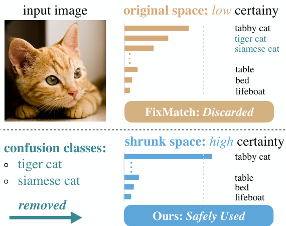 图 1: 方法动机示意图。由于存在与top-1类别易混淆的类别,置信度无法达到预设阈值(灰色虚线)。FixMatch会丢弃这类不确定样本。而我们的方法通过检测并移除混淆类别来提升置信度,从而实现对所有未标注图像的安全充分利用。