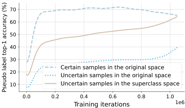 图 2: 在仅有400个标注的CIFAR-100数据集上的伪标签准确率。我们特别指出,即使对于不确定样本,其top-1预测在超类空间(20个类别)中也具有较高准确率,这种准确率甚至可以与原始类别空间中精心筛选的确定样本相媲美。